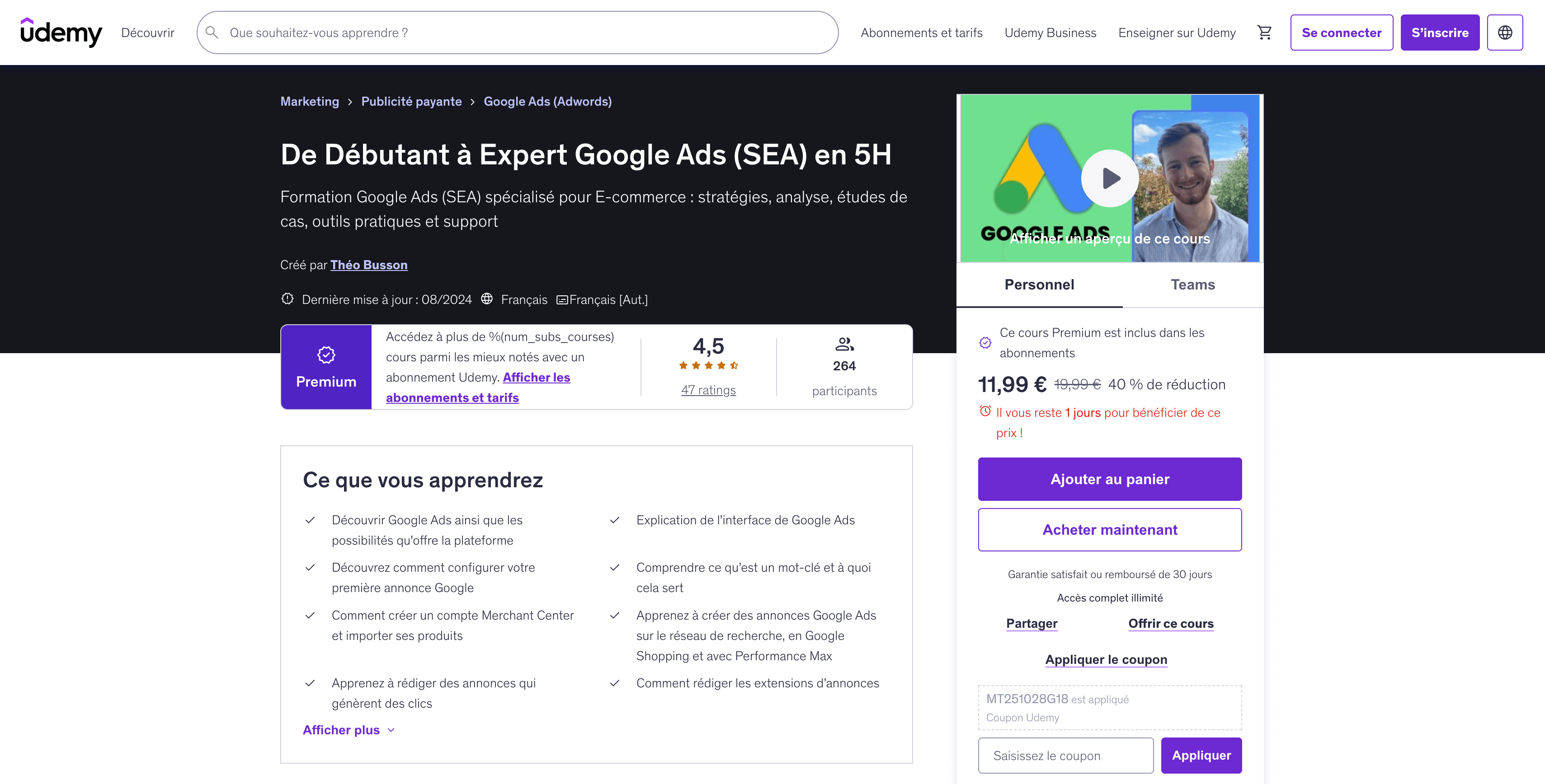 Conçue par Théo Busson, consultant e-commerce spécialisé en acquisition de trafic, cette formation Google Ads s’adresse aux entrepreneurs, freelances et professionnels du marketing souhaitant maîtriser les campagnes publicitaires Google dédiées au e-commerce. Accessible à tous les niveaux, elle promet une montée en compétence rapide grâce à une pédagogie concrète, des exemples réels et une approche pratique.